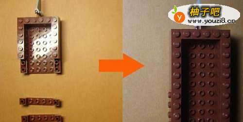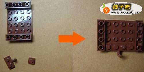4然后,拼装帆船模型的船尾底座的护栏部分。由四个装饰积木和一些零件积木所组成。左边是拼装所需的零件,右边是拼装好后的整体结构效果,如下图所示。