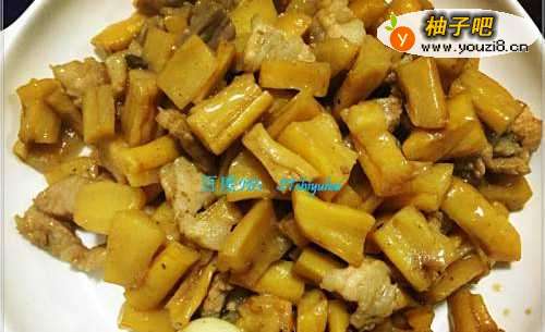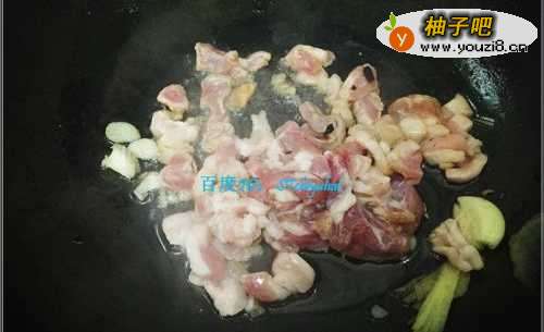 5先加入腌制的肉丝,稍微翻炒一会,待肉变色后倒入前面沥干的脆萝卜细块,混合炒一会。