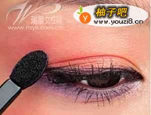 ↑在上下眼睑涂抹紫色眼影,从睫毛根部向眼窝形成渐变的眼影效果。