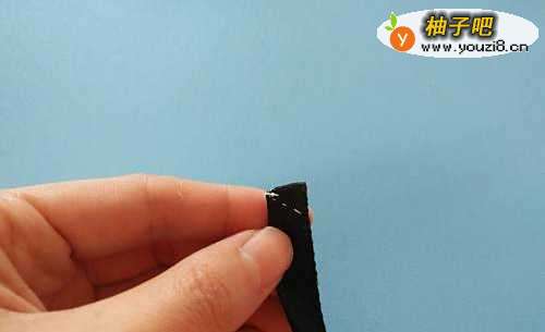 2先对折丝带,在对折的地方斜着缝一下。