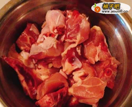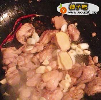 4鸡腿变色后加入葱姜蒜片和干红辣椒炒香
