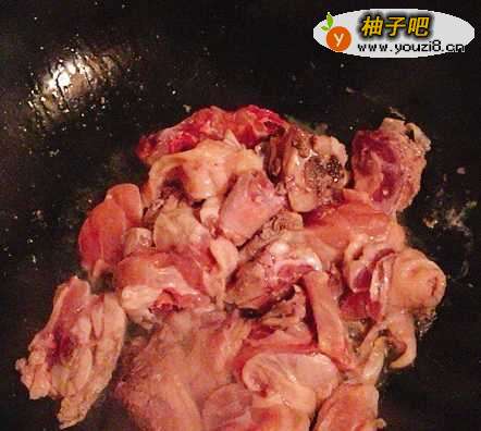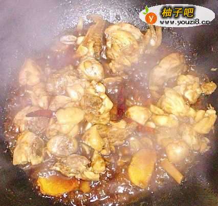 5鸡肉炒至微焦后加入料酒,生抽,老抽和蚝油,翻炒均匀