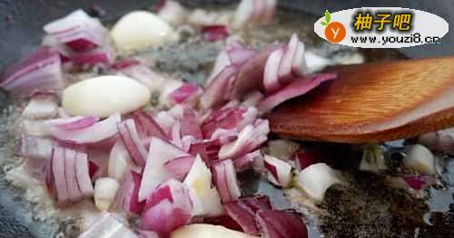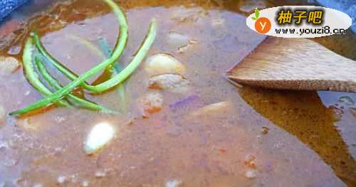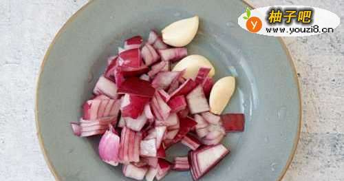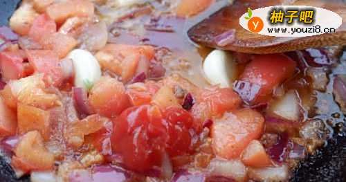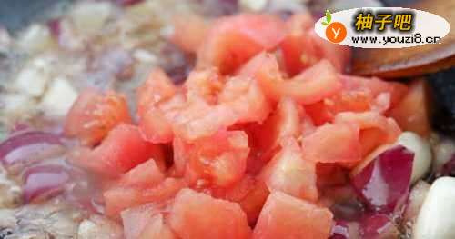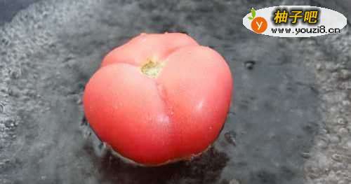 2西红柿一个,中间开十字口,热水锅中十字口朝下,焯水一小会儿去皮