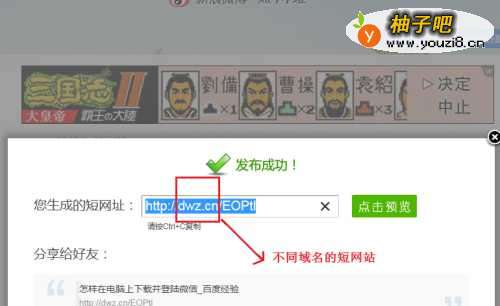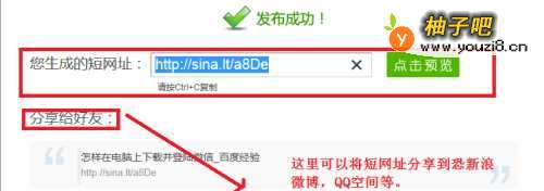 5点击【压缩一下】,新生产的短网址就出来了,可以点击预览,或者通过Ctrl+C复制,也可以分享给好友,分享到微博、QQ空间、人人网等好多地方。