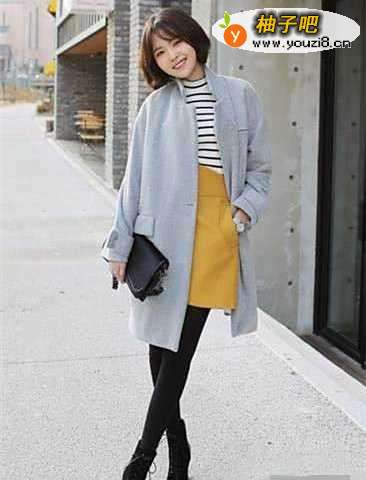 4灰蓝色大衣落肩设计显得很有大牌范,内搭条纹毛衣和黄色半身裙,明媚黄色的加入使整体看起来不那么寡淡,增添了吸睛亮点。