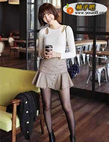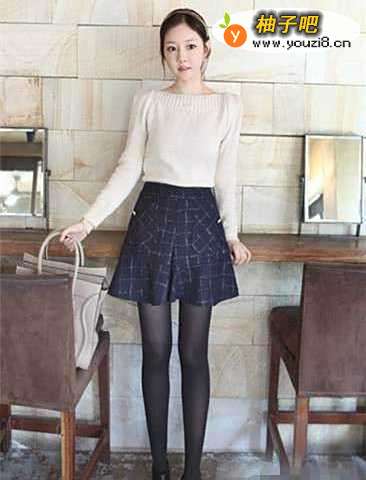 6白色毛衣精巧的一字领设计,将肩部线条衬托的很完美,清新纯净的白色使女孩看起来温柔大方,增添名媛淑女气质,搭配藏蓝色格子短裙,优雅而古典,不规则的格子图案体现了设计的特别。
