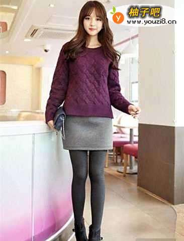 5紫色毛衣的编织花纹很精致,加上优雅迷人的颜色,释放出熟女的气质风情,配灰色短裙知性大方,不管是上班还是约会都显得很美。