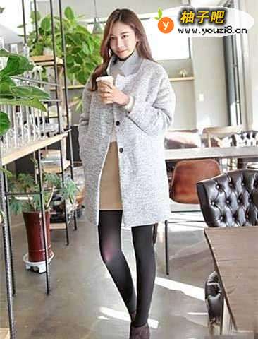 浅灰色大衣采用流行的廓形设计,宽松样式穿起来显得更有范,领口设计打破常规,采用了小立领设计,简洁而干练,配白色毛衣和浅驼色半身裙,知性优雅。