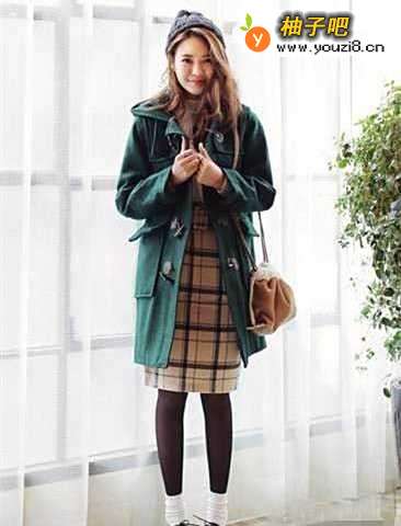 3绿色大衣采用了经典的学院风设计,舒适显瘦的直筒版型,可爱减龄的牛角扣设计,加上两个大大的口袋装饰,穿出青春时尚感,内搭白色毛衣和格纹半身裙,加上牛津鞋和白色棉袜,打造出经典的英伦学院风造型。