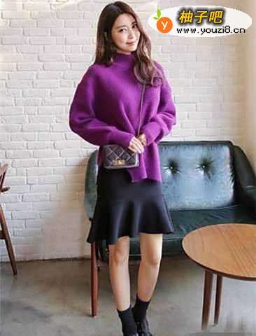 7亮紫色毛衣时尚靓丽,很显优雅女人味,宽松的廓形设计穿起来更加舒适有型,更显时髦范,下摆不规则剪裁打破常规,彰显个性,搭配黑色鱼尾裙,优雅迷人。