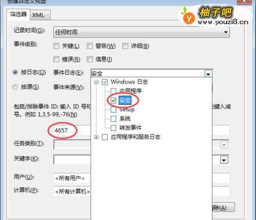 7在“创建自定义视图”对话框中,“事件日志”项选择“安全”,下方的“事件ID”项,填写“4657”.