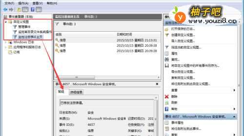4打开了“事件查看器”窗口,在这里,我们注意一下左边列表中的“自定义视图”,现在它的下一层有三项视图,其中两项“监控”视图是后添加的。添加视图的方法,在第6步中说明。