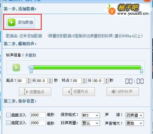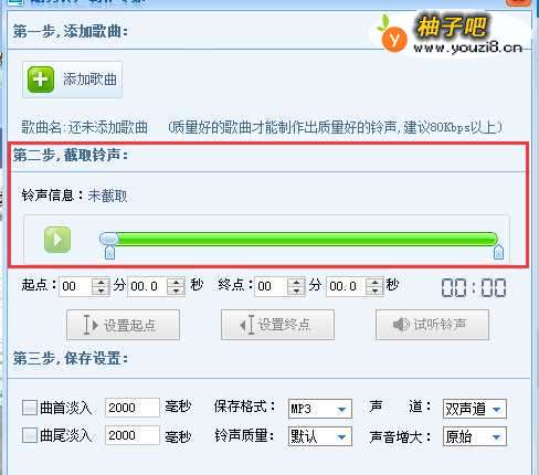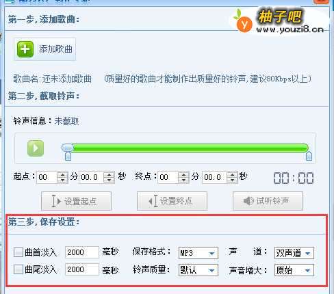 范围弄好了之后,直接在【第三步】那里勾选【曲首淡入】和【曲尾淡入】,然后点击【保存铃声】即可。