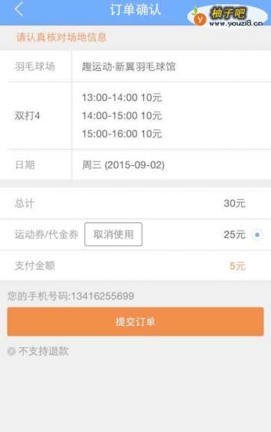 4提交订单后,请再次确认订单信息是否有误,注意此时可使用代金券进行优惠支付(平常活动送的代金券可以派上用场了~),选择代金券扣除相应金额,即可优惠订场。小编这单5元就可以畅打3个小时了哦!十分实惠