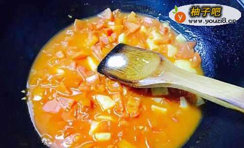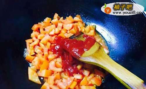 4番茄被炒出沙之后,加入50克番茄酱继续翻炒均匀。番茄酱越多,番茄汤的口感越好。