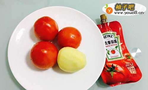 首先准备好所有与食材,将番茄洗干净,土豆去皮,番茄用开水烫一下,然后去掉表皮备用。