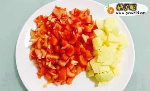 2然后把番茄和土豆都切成丁,分开装在盘子里备用。
