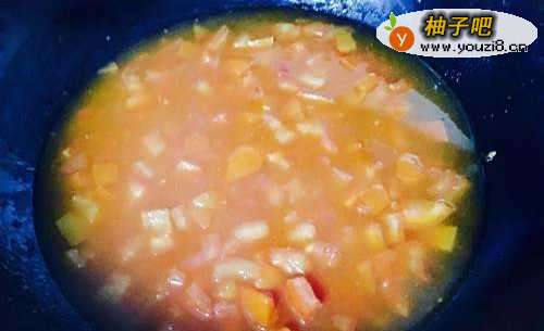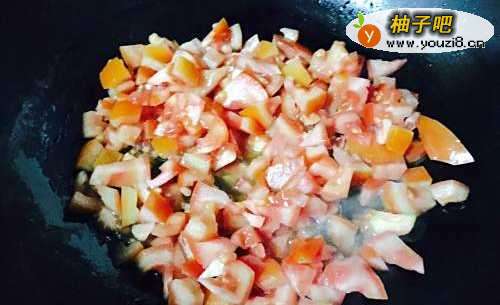 3开煤气,锅烧热之后加入少许油,油热至8成热的时候,先把番茄丁倒进去超出汁水。