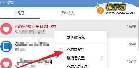另外我们也可以右键点击要查看的QQ群,然后在弹出菜单中选择“查看群资料”菜单项。