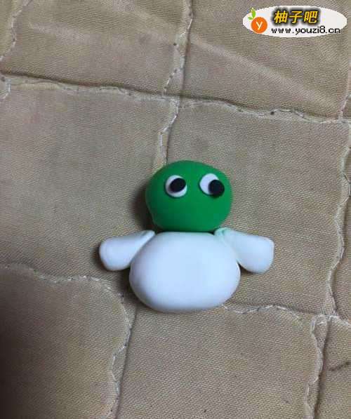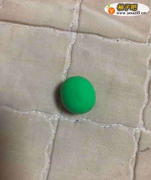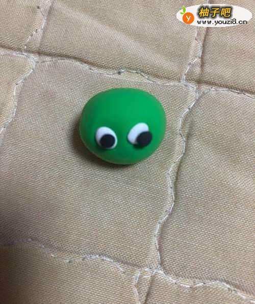 拿出绿色的彩泥揉成个圆形,在拿出白色的彩泥揉成两个圆形按扁,粘到圆形上面。