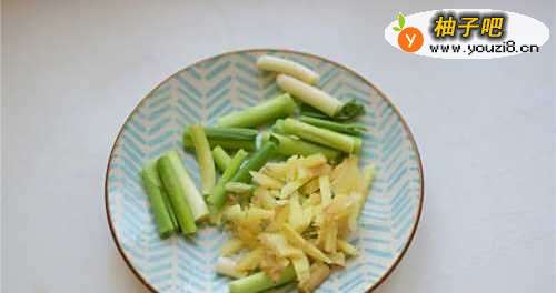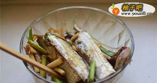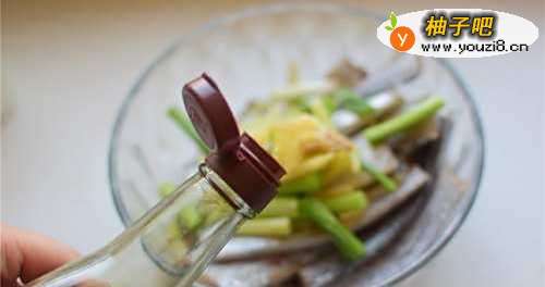 3葱姜加入带鱼中,加料酒、老抽、生抽