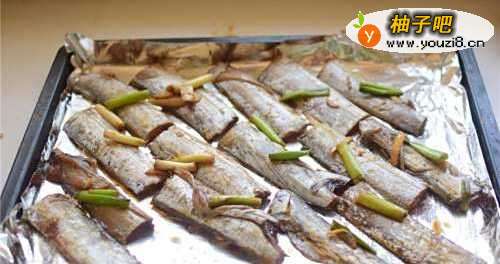 6烤盘上放一张锡纸,再刷一层食用油,将腌制好的带鱼放在烤盘上的锡纸上,鱼上再刷一层油这样烤不至于粘在烤盘上,