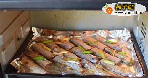 7烤箱180度,中层上下火烤10分钟,取出来翻面,把腌制鱼的汤汁都在每个带鱼身上,再烤15分钟