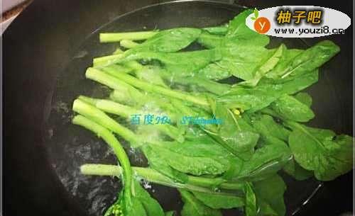 3待水沸腾之后,将清洗好的油菜心放入烫一阵,待油菜心差不多熟透后将其捞出沥干。