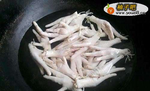 2锅中放入足量的清水,将鸡爪放入凉水中,大火烧开后,把鸡爪焯水,捞出备用