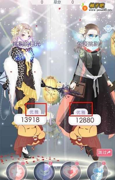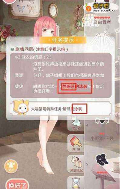 6还有一种就是TGA服饰,所谓TGA服饰就是一些有着特殊属性的服饰,一般大喵会给的提示是:请寻找XX,例如:泳装、兔女郎、波西米亚的长裙、OL、婚纱、居家服、小动物等。不同的关卡TGA服饰对分数的影响也不同,虽然无法知道影响为那个等级,但还是在同属性服饰里优先选择TGA服饰为好。