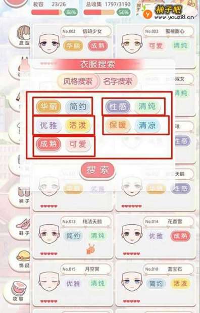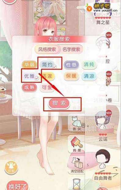 3现在暖暖新加了搜索风格搜索的功能,只要选中“发型”“连衣裙”等服饰再点击搜索即会出现属性选择的功能。我们选择示例中要求的风格的简约,优雅,再点击红色的搜索,便会出现你的衣柜中的符合简约优雅的属性。如果没有符合这两个属性的衣服则以你对提示的感觉判断符合的属性搜索即可。