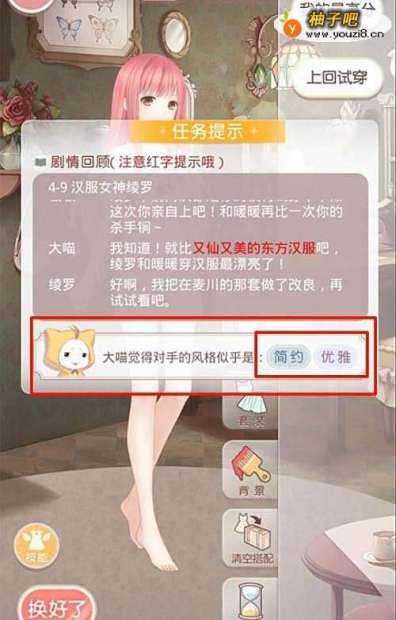 2然后,我们进入关卡进行搭配。点开任务提示,我们会看到大喵给我们的提示,如图中的:简约,优雅。而总共是5个属性,我们只知道两个属性,那么这两个属性一般占分数比例就会比较多。所以进行选择搭配时应尽量找符合这两个属性的衣服或饰品。