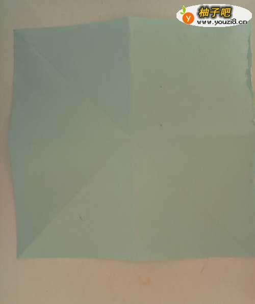 3之后我们将这出来的小正方形边缘向内折叠,中间对齐即可,效果和折法如图所示。注意在顶端的角角的地方一定要小心,不然这出来不好看。这个步骤的用处是为了折出辅助线,折完后打开即可。