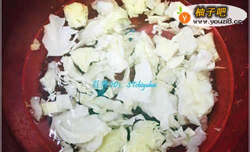 2准备一个包菜心,将包菜心层层剥开,然后过水清洗一下,将其捞出沥干备用。