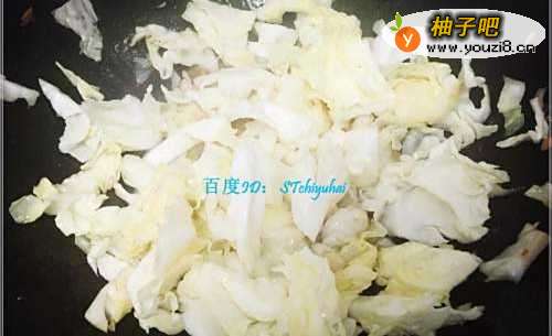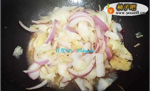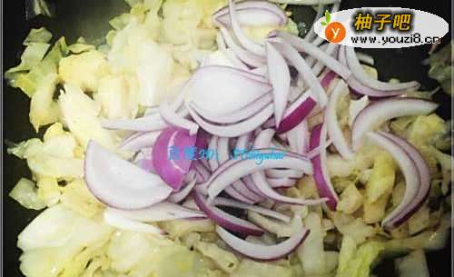 5包菜叶炒软之后,加入前面切好的洋葱丝条,混合炒一会,可以将包菜拨至两边,露出中间部分,将洋葱丝炒软。