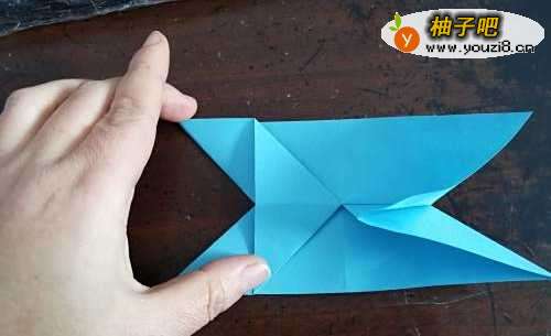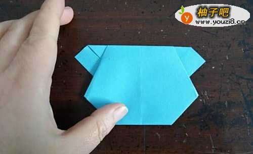 5把下侧的边向上折,顺势把中间的角折平,另一侧同样,如图二。把左右互折,如图三。