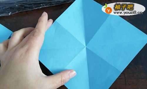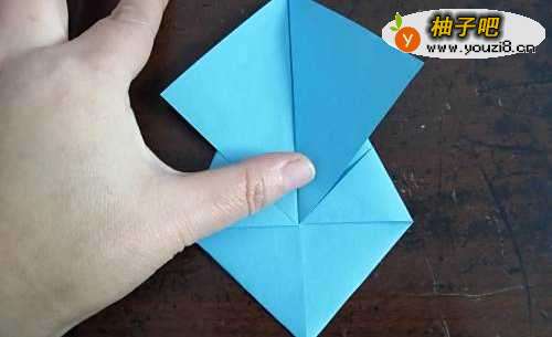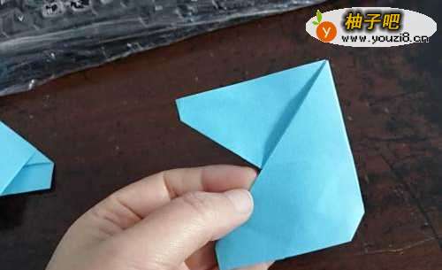 推荐使用10*10的彩纸,把其中一张的两边对折,再把下侧的角向内折,翻到背面,把上侧的脚角向内折。