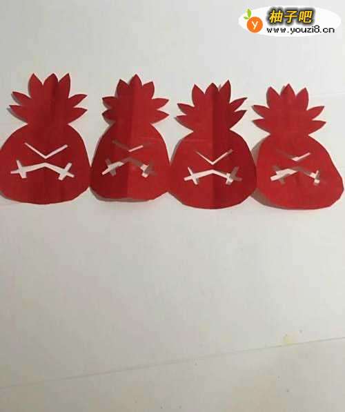 少儿手工剪纸之 怎样用红色彩纸裁剪一条漂亮的菠萝花边 需要材料长方形彩纸 连续对折三次 然后在上面画上半个菠萝和它的叶子 还有果实的花纹等等 边缘的连接部分不要剪断 最后剪下即可