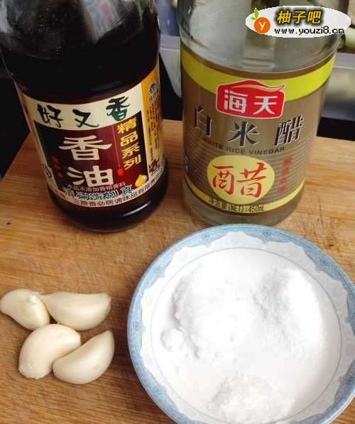 3准备好调料。盐、糖、味精、蒜、醋、香油,具体用量看个人口味,还可以加入芝麻和花生末。蒜用刀拍倒后切碎。