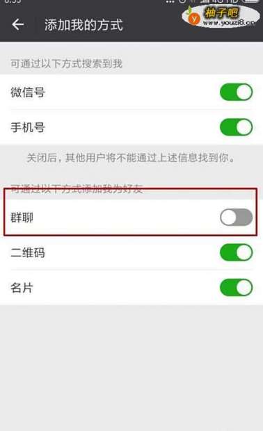 6我们将群聊后面的开关关闭,这样其他人就不能通过群聊添加自己为好友了。这样可以减少很多陌生人骚扰。