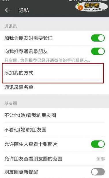 4在隐私界面,我们可以对自己自己微信与他人互动的设置做一些调整。我们选择通讯录里的“添加我的方式”。