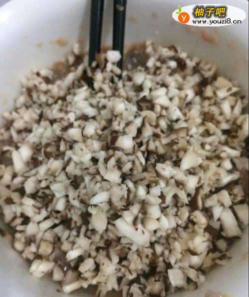 4再放入剁碎的香菇加一点水搅拌均匀备用。