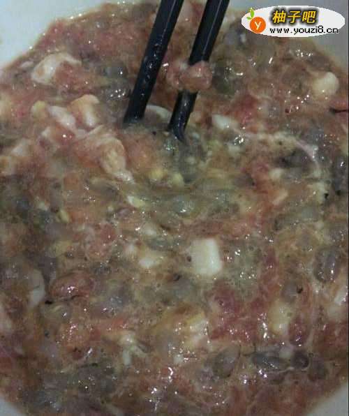 3剁碎的肉和虾肉混合放入鸡蛋、淀粉、生抽、盐搅拌均匀。