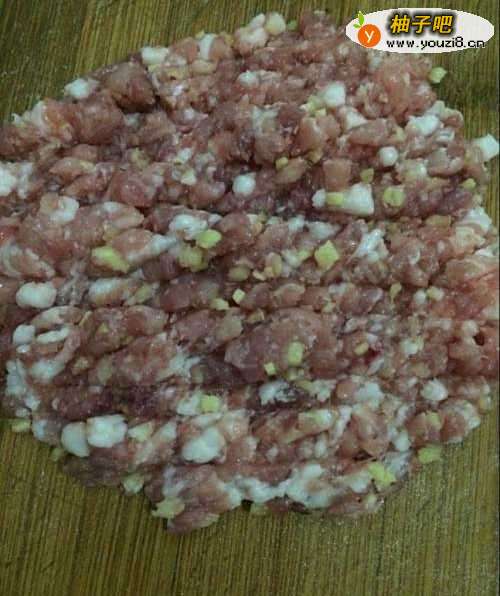 把虾去壳,除去虾线和肉一起剁碎。肉里面再放点姜一起剁。