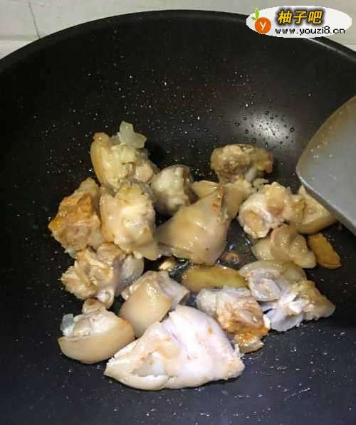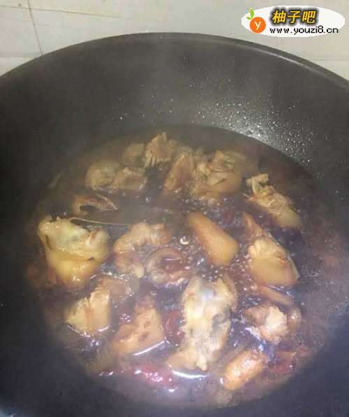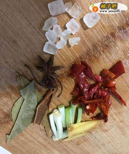 7把八角、桂皮、香叶、剩下的姜片、干辣椒、葱段、老抽、生抽、耗油、1勺料酒倒进锅里,再倒入凉白开翻炒均匀,开大火煮沸后转至小火煮20分钟左右