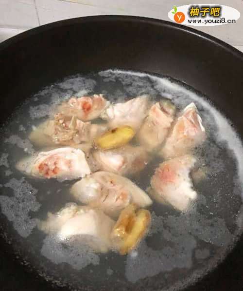 2猪蹄剁成小块,锅里倒适量冷水、2勺料酒、2片姜片,把猪蹄倒进去煮开,撇去浮沫