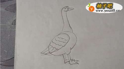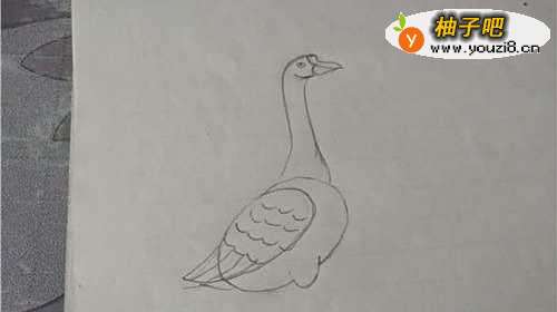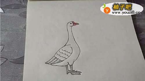 6最后,我们用黑笔勾线,用橡皮把多余的铅笔痕迹擦掉,再把大白鹅涂色就可以了。