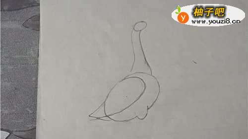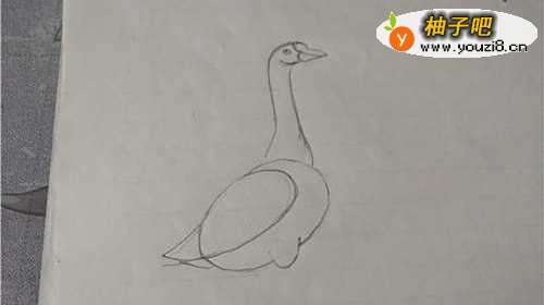 先准备好绘画工具,在纸上先画上一个倾斜着的椭圆形,再把大白鹅细长的脖子和圆滚滚的身子画出来。