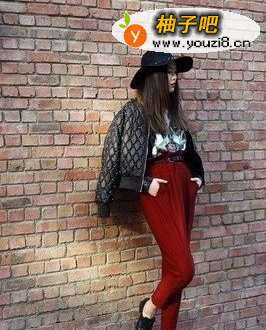 5酒红色裤子搭配黑色皮牢获杰衣,特别的酷,很潇洒而且个性。