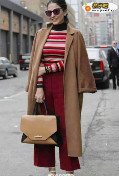 6酒红色裤子搭配红蹲趴白条纹打底再搭配啡色大衣,很有气质,女人味十足,而且很有气场。